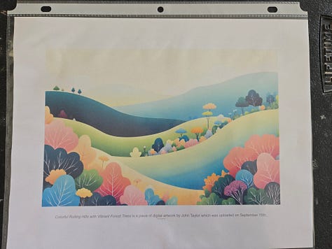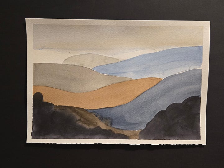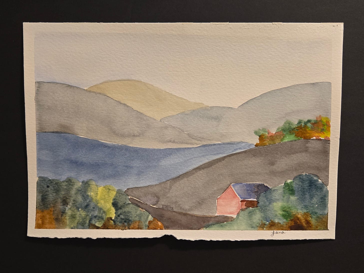Here was my final image for the class, which was an amalgamation of the hills scene and the barn with shading. I ended up using the neutral palette for the hills and regular primaries for the barn and greenery, but learned that I’m not supposed to use these palettes together.