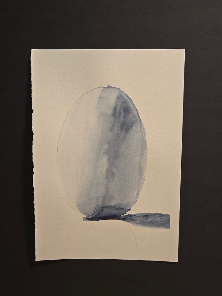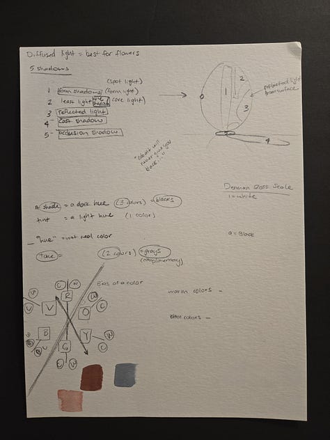 In a nutshell, we were learning how to create shadow by using a darker version of the object’s original color and mixing that color with its complement on the color wheel - avoiding black or gray pigments which makes the shadow too stark and unrealistic.